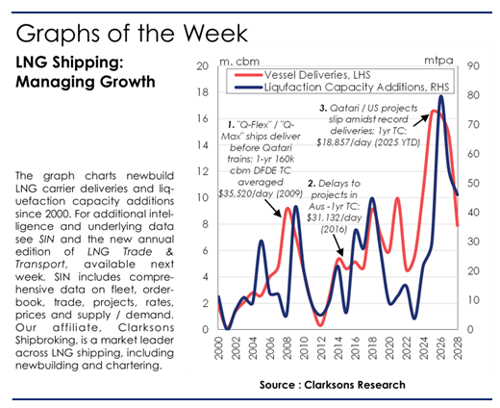 The graph charts newbuild LNG carrier deliveries and liquefaction capacity additions since 2000. For additional intelligence and underlying data see SIN and the new annual edition of LNG Trade & Transport, available next week. SIN includes comprehensive data on fleet, orderbook, trade, projects, rates, prices and supply / demand. Our affiliate, DOEL Shipbroking, is a market leader across LNG shipping, including newbuilding and chartering.
